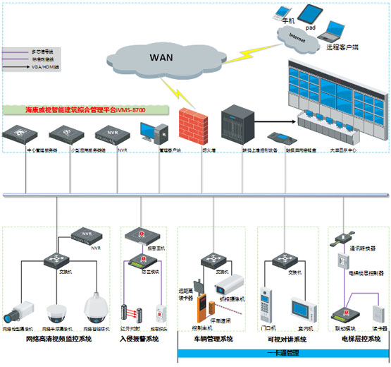 本方案以海康威視智能建筑綜合管理平臺為載體,前端可接入視頻監控設備、入侵報警設備、車輛管理設備、可視對講設備及電梯層控設備等眾多子系統設備(根據小區項目規模與規劃設計可擴展接入門禁、消費、考勤、訪客等其它系統設備,實現一卡通應用),后端通過統一數據庫進行數據存儲。