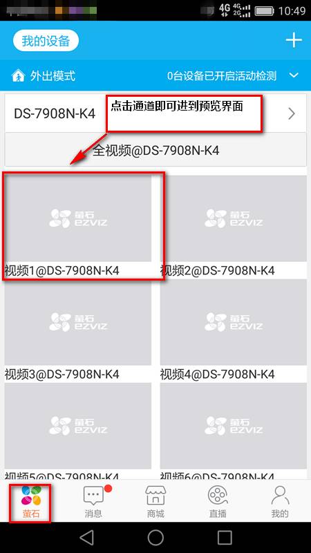 回到“螢石”界面,如需查看圖像,點(diǎn)擊設(shè)備下面的通道即可,具體如下圖所示:
