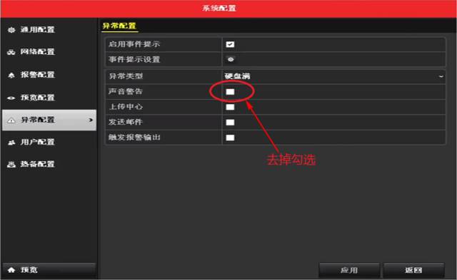 進入到系統配置-異常配置—異常類型,將異常類型每個選項,對應的聲音警告打鉤取消,點擊應用。去掉哪個類型,錄像機不再報警,那就說明是該原因引起的報警,再針對原因做相應處理。