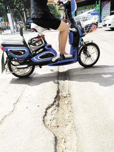在振興路與吉品街路口西側,有一條“溝壑”穿馬路而過,由于“溝壑”回填得不太好,路面上留有一條深約10厘米,寬約20厘米的溝,不少騎電動車的市民經過此處時都顛簸得厲害。“這條溝存在很長一段時間了,也是安裝監控時留下的,原先用沙土回填一部分,但是隨著時間的推移,回填的沙土下陷,就出現了現在的這條溝,很不安全,雨天的時候溝里面會積滿污水,車輛經過時,污水還會濺到行人身上?!焙咳缡钦f。
